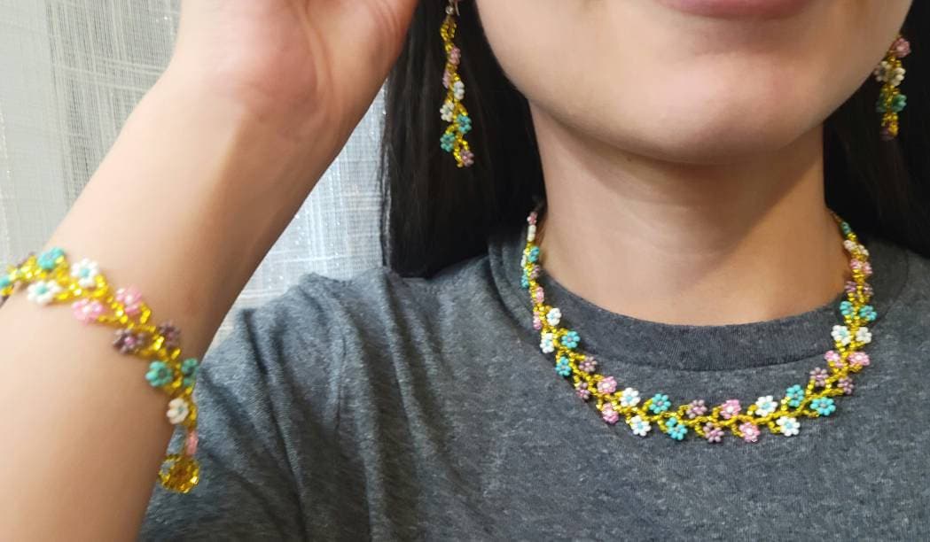 Collar Gargantilla Florecitas Chaquira SET 3 piesas Gargantilla, aretes, pulcera